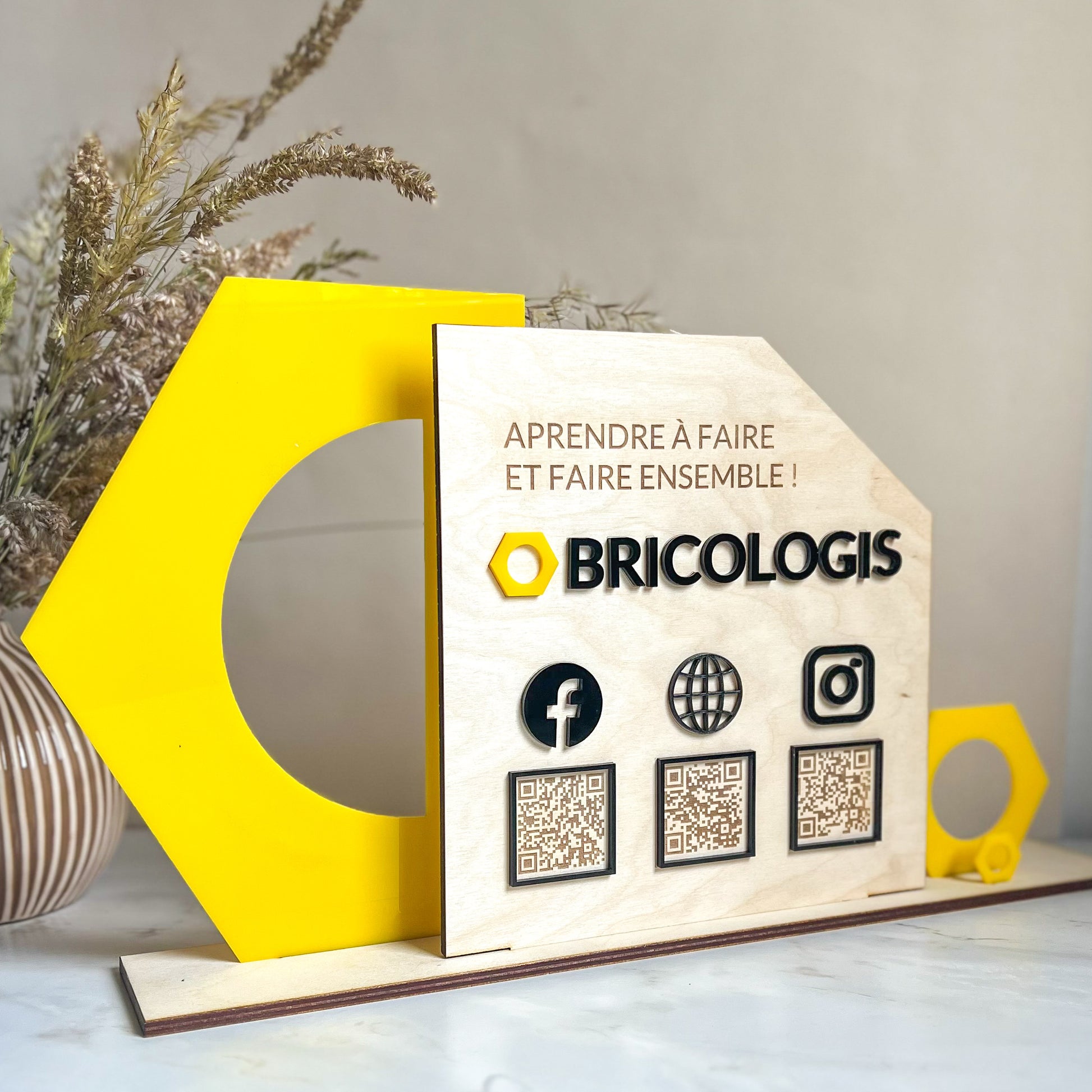 Réalisé en acrylique ou bois, il se personnalise avec votre logo, vos couleurs et la forme de votre choix. Idéal pour les entrepreneurs, créateurs et commerces souhaitant soigner leur présence digitale.